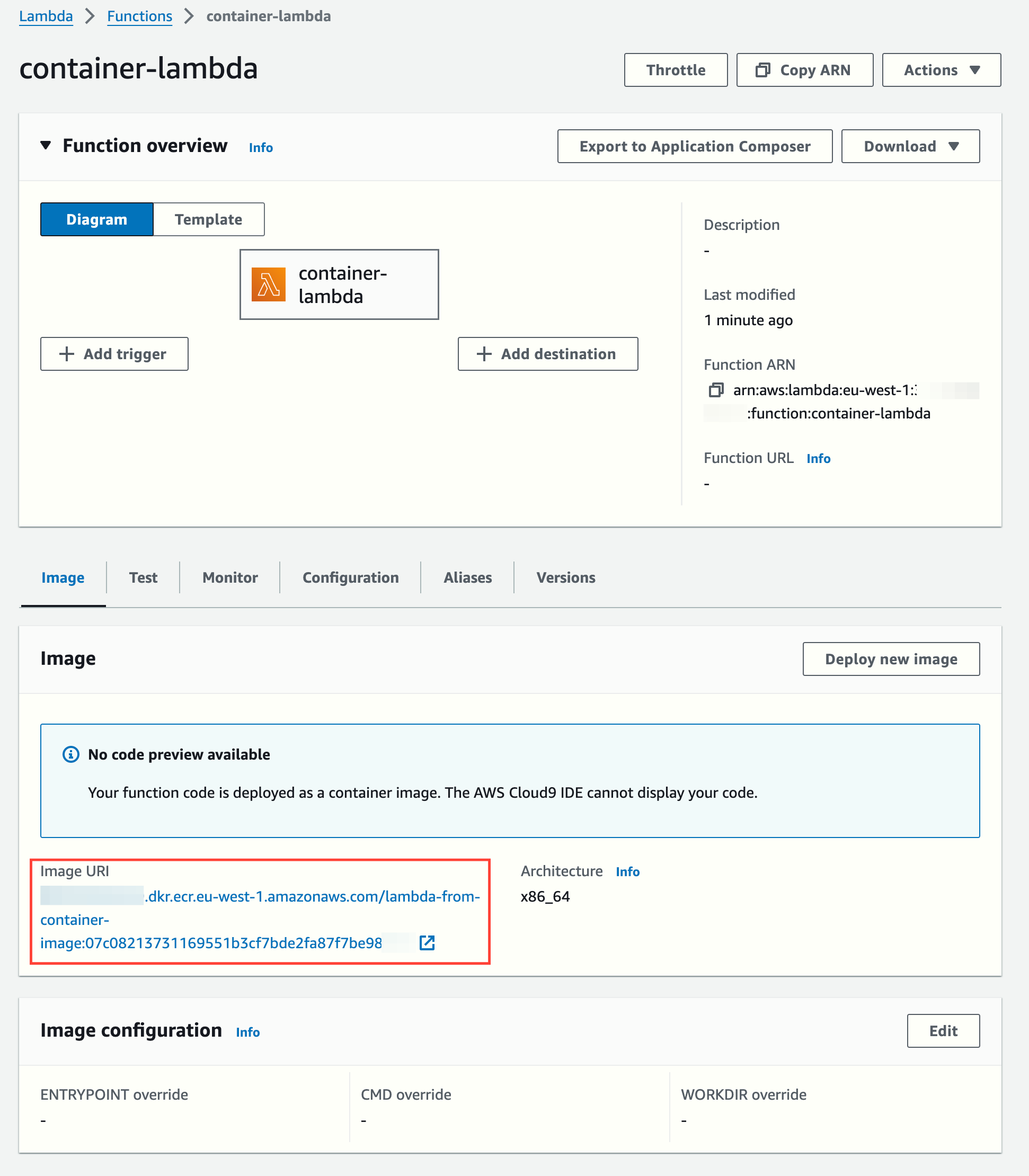 Following this guide to configure the pipeline, every commit to your GitHub repository will trigger the pipeline that builds a new container image and automatically updates the Lambda function.