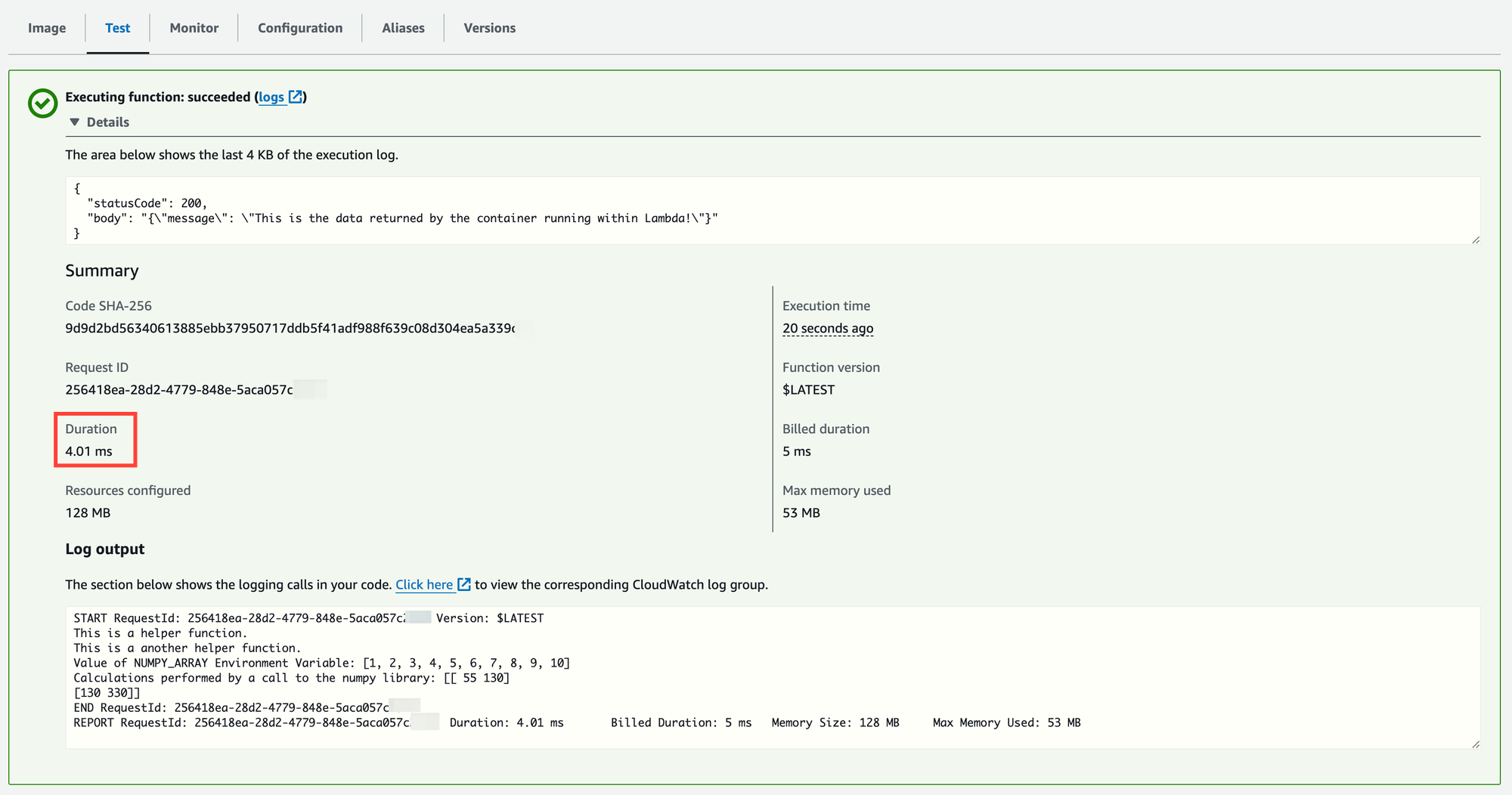 Running a test shows the changes. Notice there is a cold start, as expected (later invocations take single-digit ms to execute):