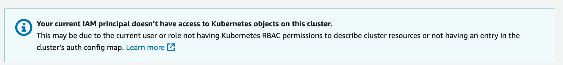 Initially, just after the creation of the EKS Cluster, only the cluster creator can fully interact with the Kubernetes cluster resources. Other IAM Users or IAM Roles trying to access the EKS resources on the AWS Management Console will get a message like this: