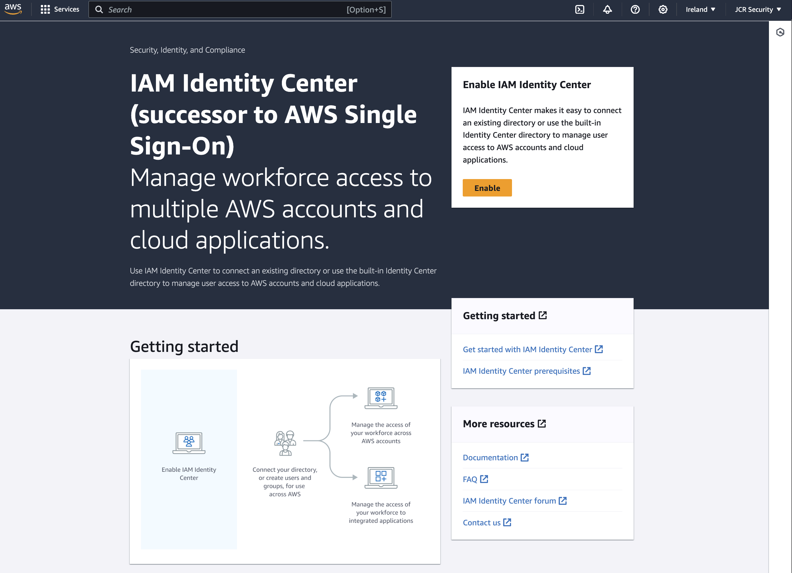 Initially, the IAM Identity Center dashboard in account JCR Security does not allow the management of IAM Identity Center.
