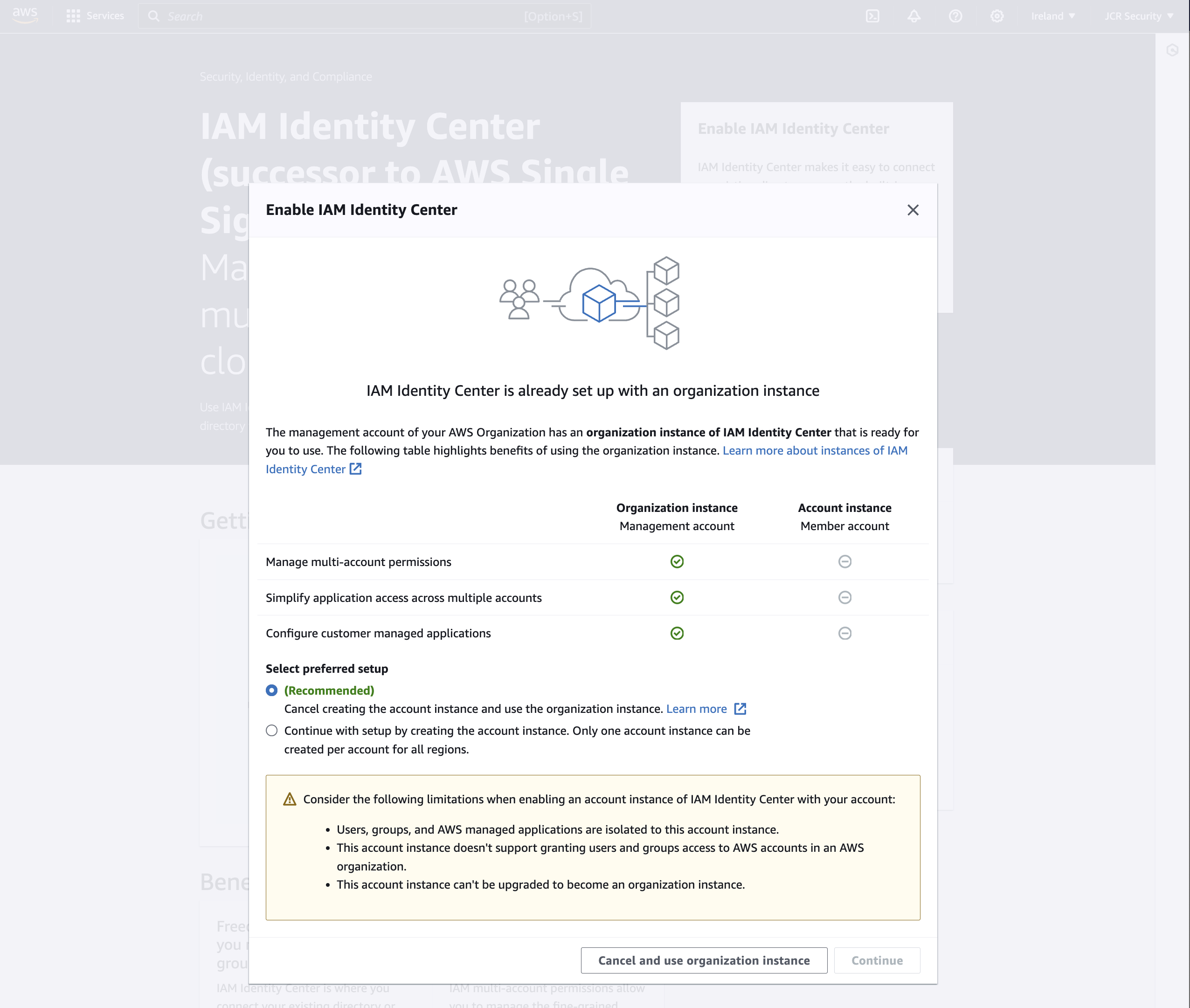 As IAM Identity Center has already been configured in the AWS Organization, I get a message stating it. I'm also given the option to configure and IAM Identity Center account instance, but that is not what I want.
