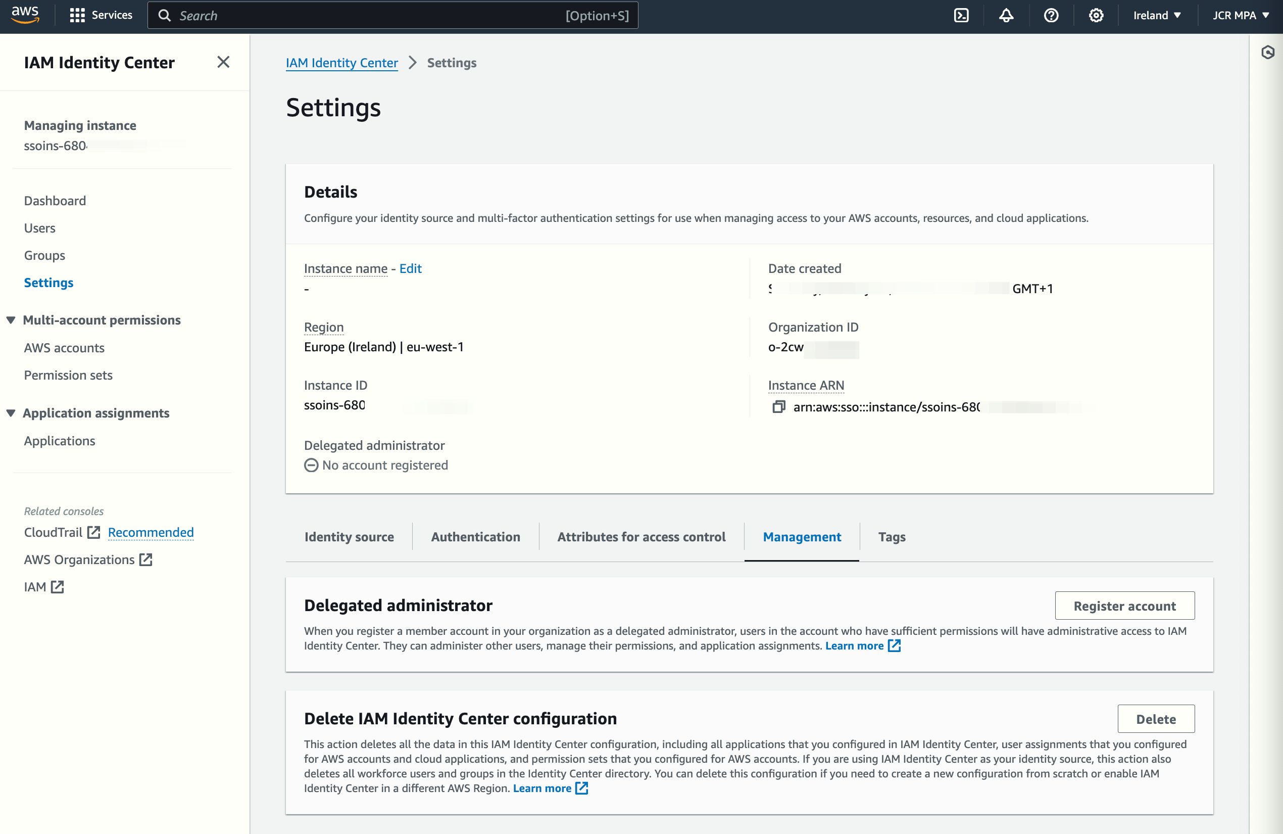 To allow the JCR Security account to manage IAM Identity Center, I need to register it from the AWS Organization Management Account (in my case, the account called JCR MPA). In the settings section, in the Management tab, I can see no delegated administrator account registered yet.