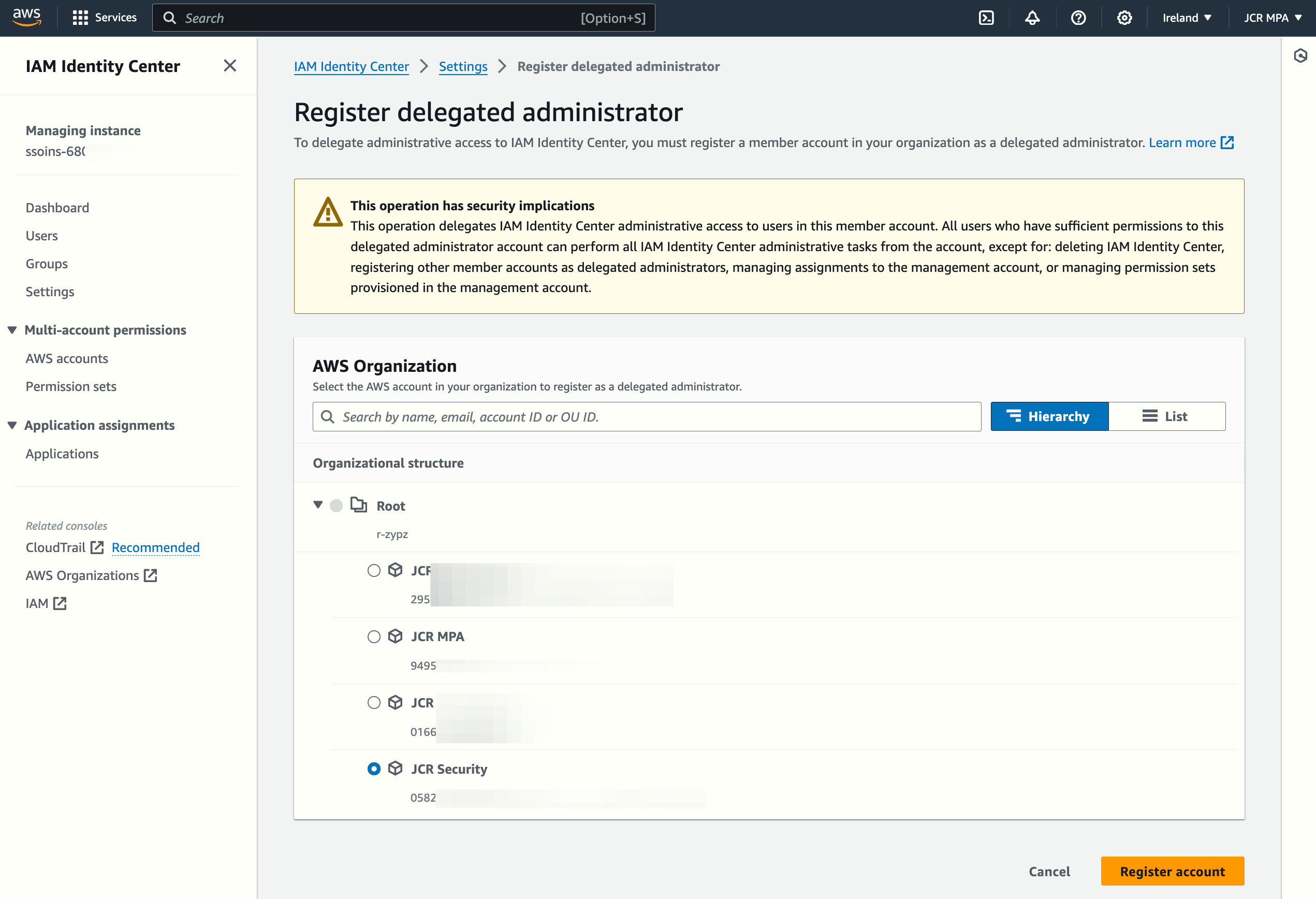 After clicking on the "Register account" button, I can now choose the JCR Security account as the delegated administrator:
