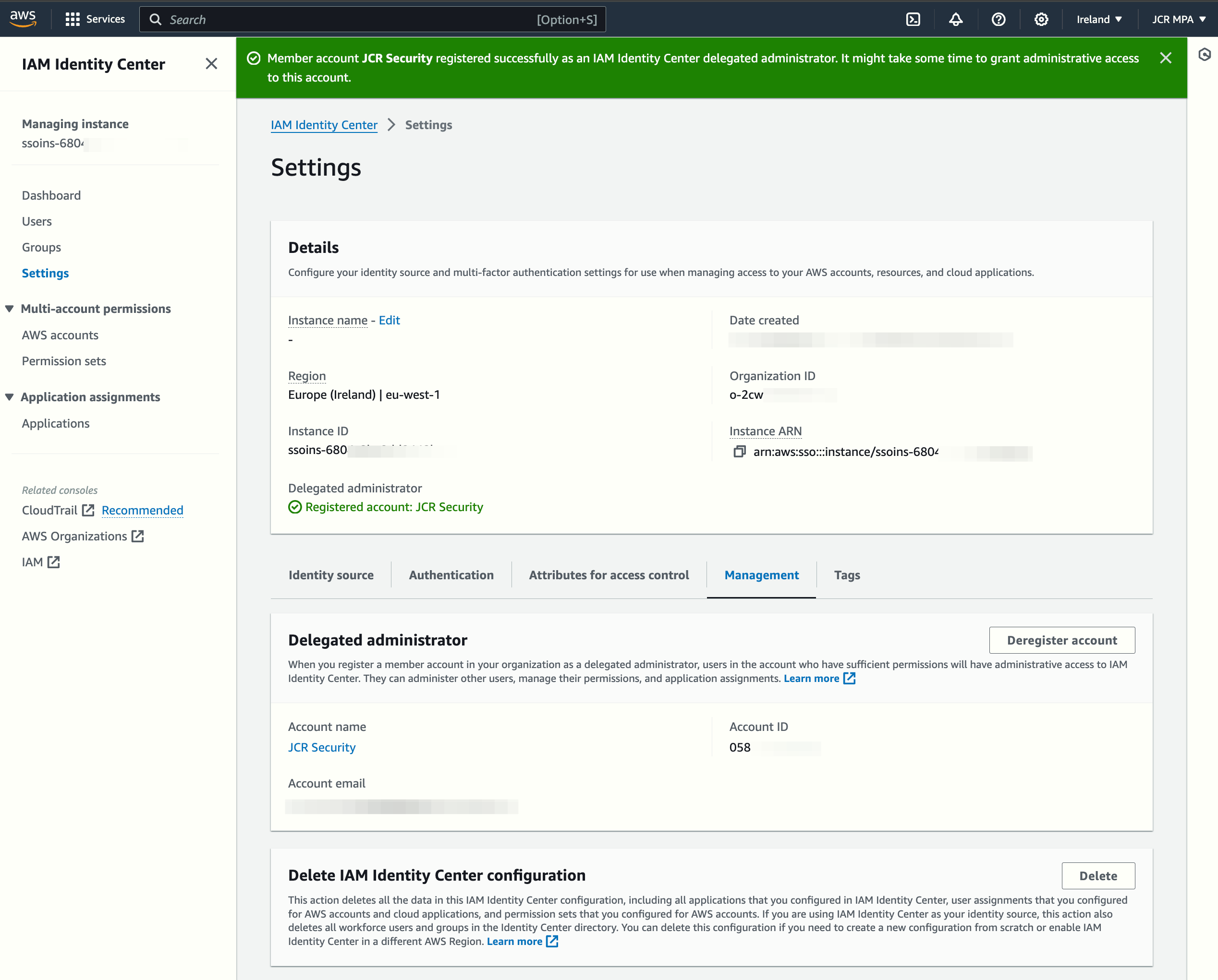 The Management tab now shows the JCR Security account as the delegated administrator.