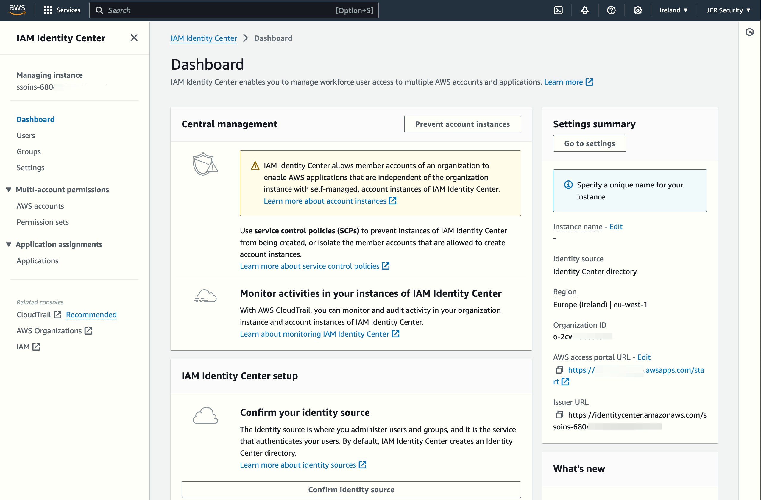 Back in the JCR Security account, the IAM Identity Center console is available.